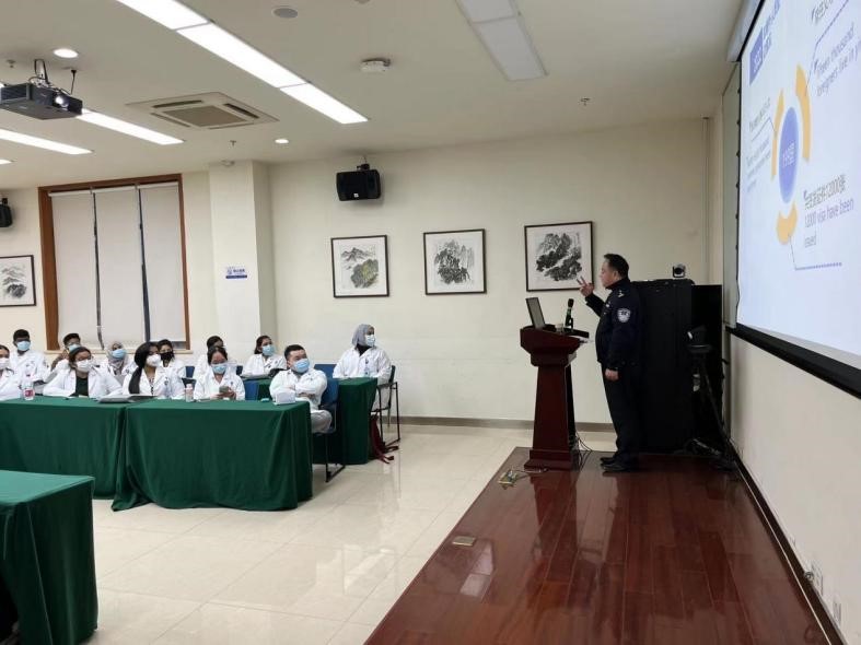Afterward, staffs from the International Department, Hospital-Acquired Infection Control Department and Security Department introduced the basic information of ZJU4H, the precautions for prevention and control of hospital infection and fire safety respectively. Finally, Yang Mi, deputy director of the Teaching Department introduced in detail the relevant rules and regulations and distributed study materials.