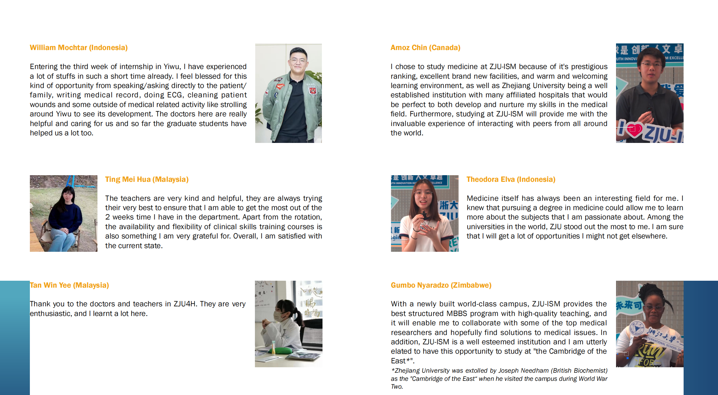 *Zhejiang University was extolled by Joseph Needham (British Biochemist) as the 'Cambridge of the East“ when he visited the campus during the World War Two.