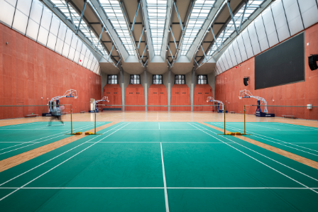 The Sports Hall is centrally located on campus, with a total floor area of 9,300 m². It houses basketball and tennis courts, squash and table tennis rooms, fitness and training rooms, and other multi-purpose spaces. The ground floor features a 50-metre indoor heated swimming pool.
